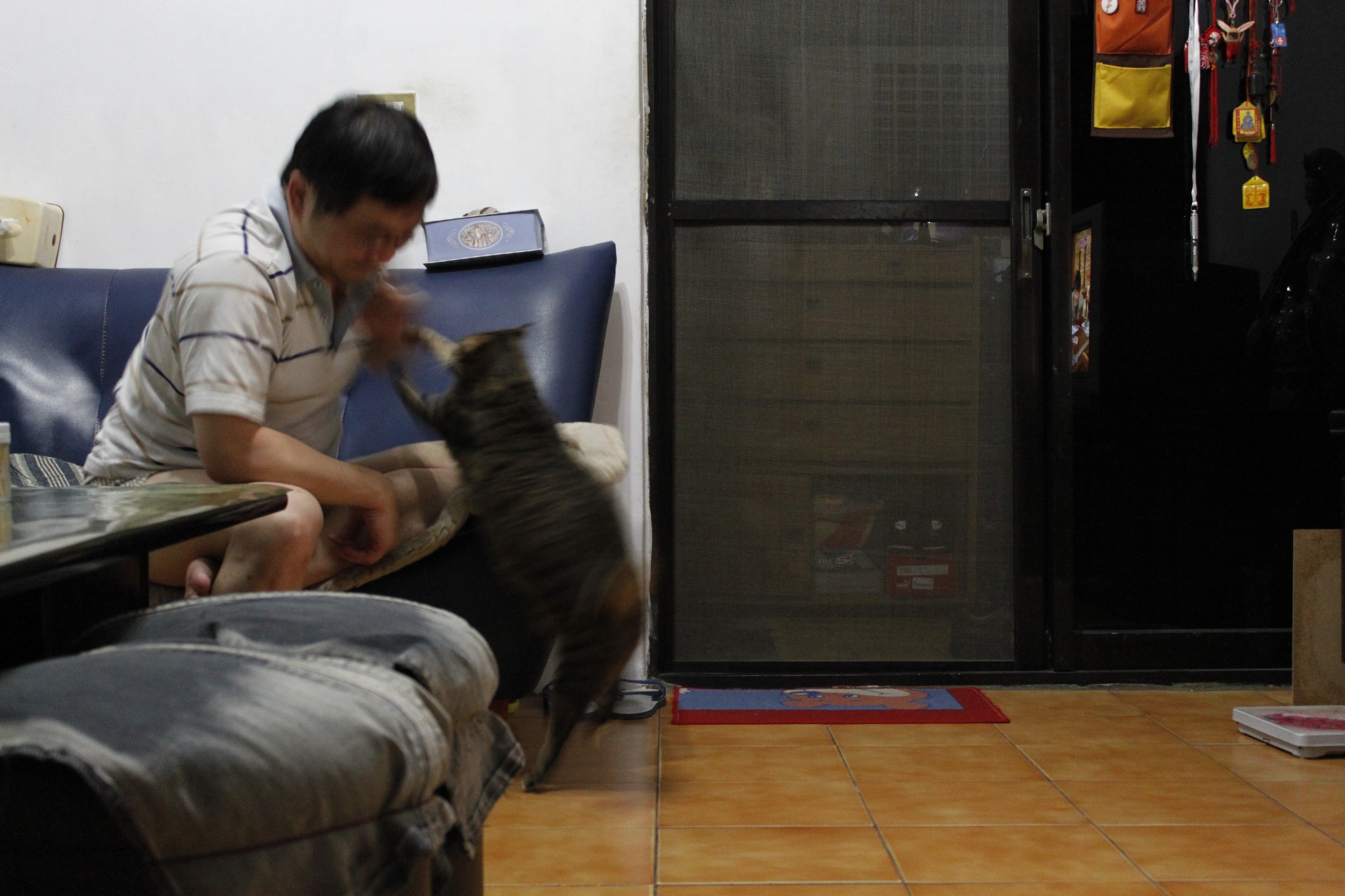這種陪玩的時段很快就停止了,因為某次晚上我在理毛得很開心的時候,硬是被丟到床下去玩追毛棒遊戲,這真是太超過了,就算再怎樣任勞任怨的守護也想要有點個人時間吧。(壓耳)